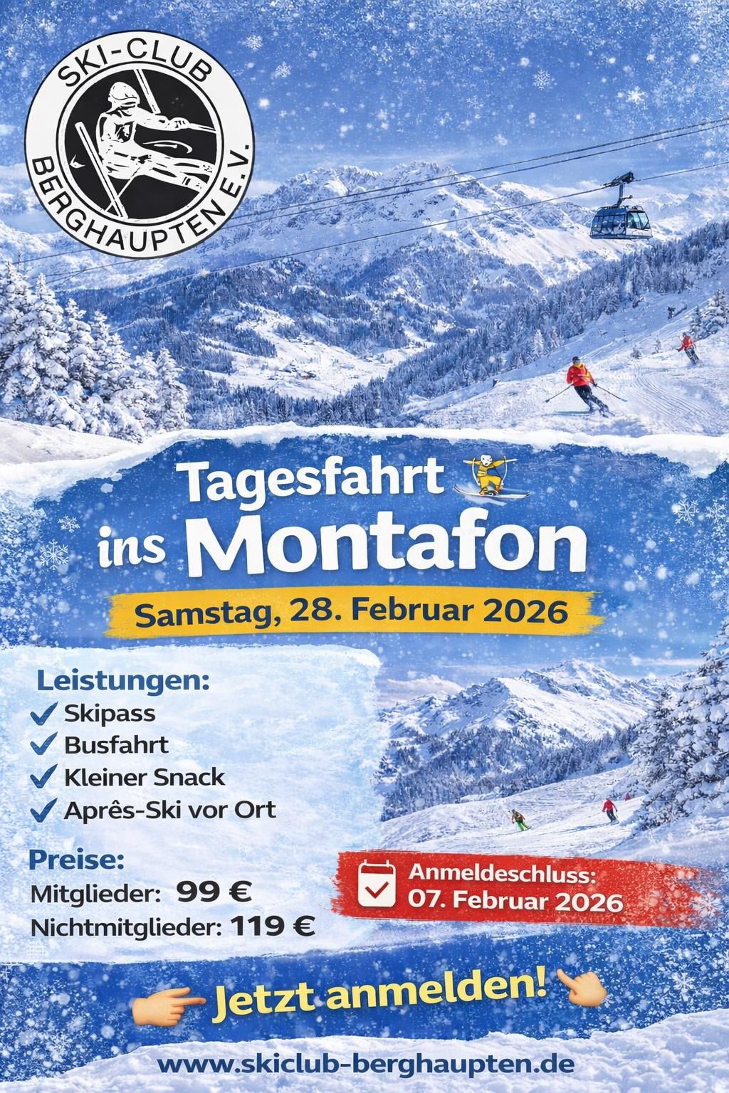Ski + Snowboard Tagesfahrt ins Montafon, St. Gallenkirch (AT)Der Skiclub Berghaupten e.V. lädt alle Ski- und Snowboardfreunde herzlich zu einer gemeinsamen Tagesfahrt ins wunderschöne Montafon ein. |